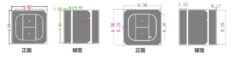 6868、8585D系列是深紫外线UVCLED,采用四颗芯片组合封装,高功率发射,发光角度 分别有30°、60° 6868、8585D series are deep ultraviolet UVC LED, using four chip combination package, high power emis-sion, light Angle of 30°、60° |